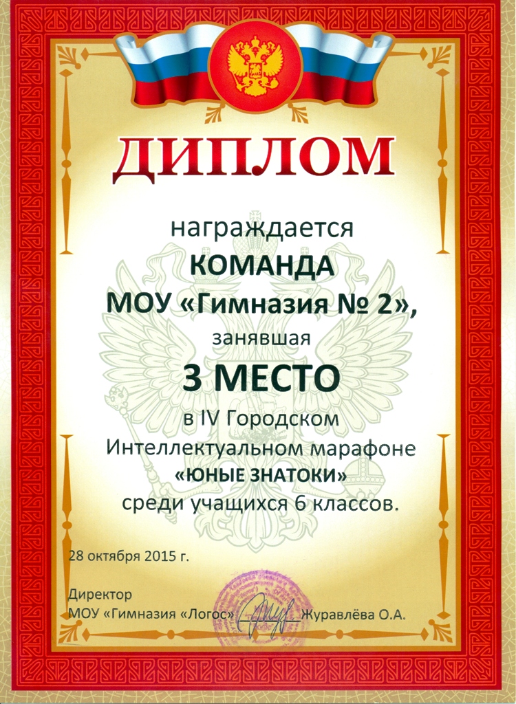 Диплом Юные знатоки_201528 октября 2015 года в гимназии «Логос» проводился IV Интеллектуальный марафон  «Юные знатоки» по русскому и английскому языкам, математике и биологии. В конкурсе принимали участие обучающиеся 6-х классов. Наша команда 6 «Г» класса (классный руководитель Семенова Е.В.) заняла III место. Поздравляем юных знатоков нашей гимназии: Большакова Захара, Смирнова Егора, Порунова Дмитрия и Маслову Полину! Желаем всем гимназистам дальнейших учебных достижений и побед!