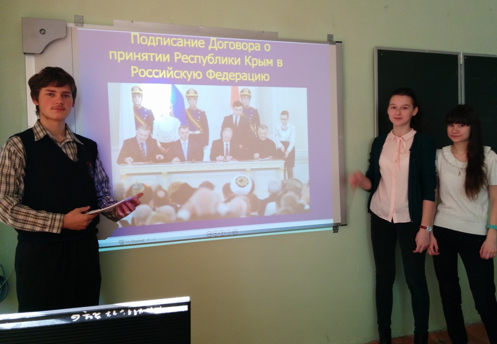 Классный час был посвящен годовщине присоединения Крыма к России. Вопрос присоединения Крыма и Севастополя к РФ по-прежнему вызывает ожесточенные споры, как на международной арене, так и внутри российского общества. Европа называет присоединение Крыма – аннексией, Россия — упирает на результаты общественного мнения.