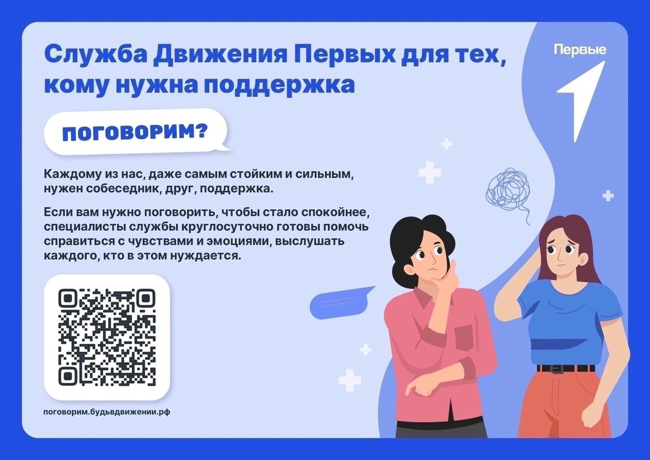 Движение первых запустило работу круглосуточной службы адресной поддержки «Поговорим?», специалисты помогут разобраться детям и взрослым в самых разных темах: отношения, лень, непонимание, чувства и эмоции, конфликты, самоопределение, буллинг, безопасность, стресс. Специалисты службы консультируют как детей, так и взрослых. Обращаться можно неограниченное количество раз.