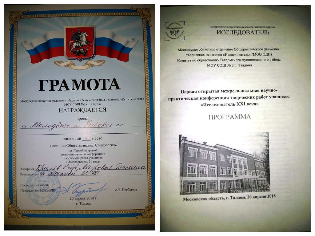Данный проект был высоко оценён жюри и получил 2 место в секции «Обществознание. Социология».
