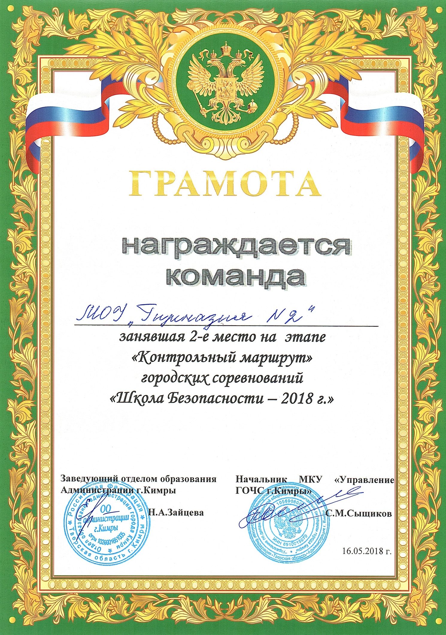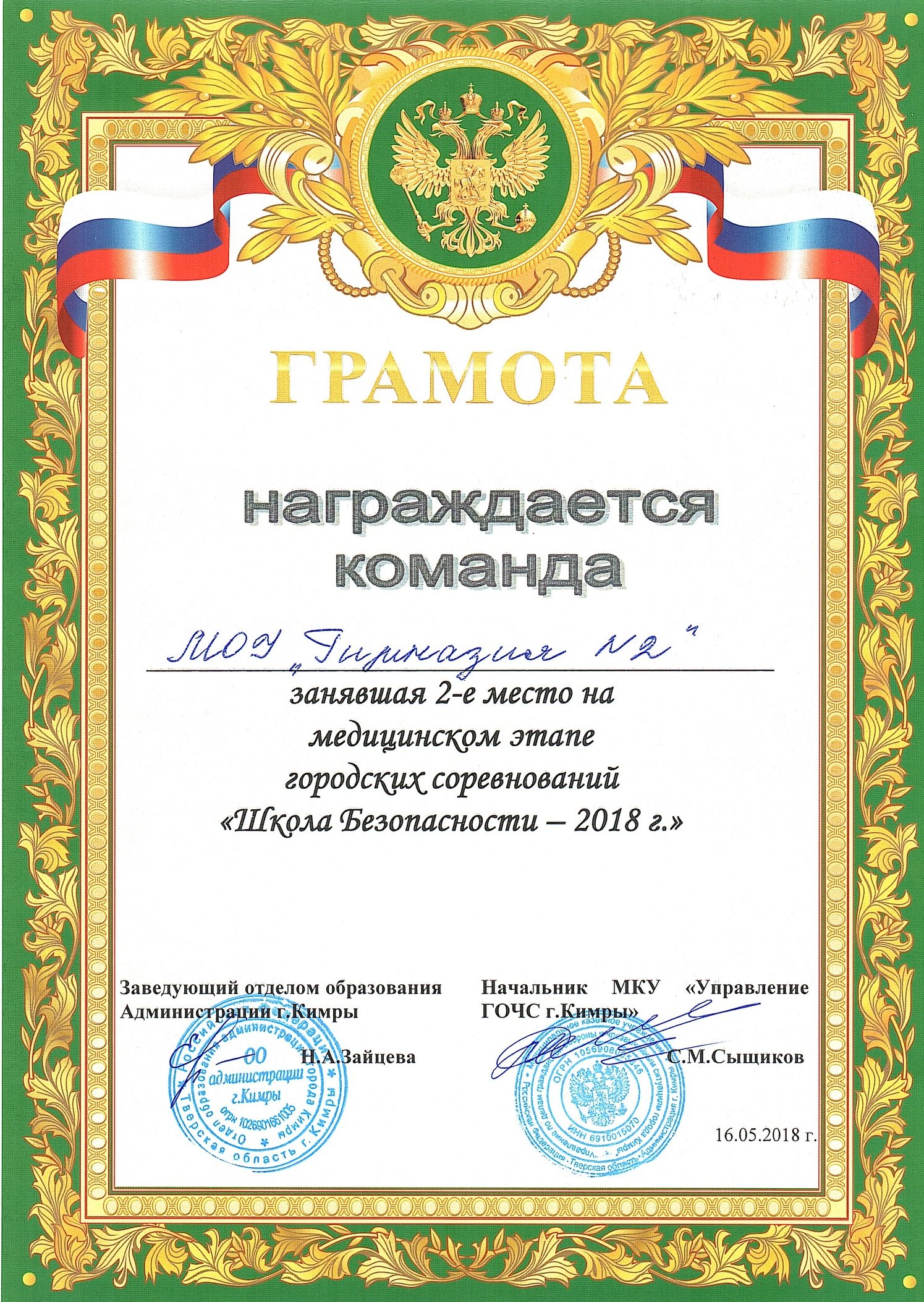 Команда нашей гимназии, в которую вошли учащиеся 11 «Г» и 8 «Г» классов (капитан команды – Виноградов В., руководитель – преподаватель ОБЖ Андриасян Е.Г.), заняла 2-е места в номинациях «Контрольный маршрут» и «Медицинский этап».