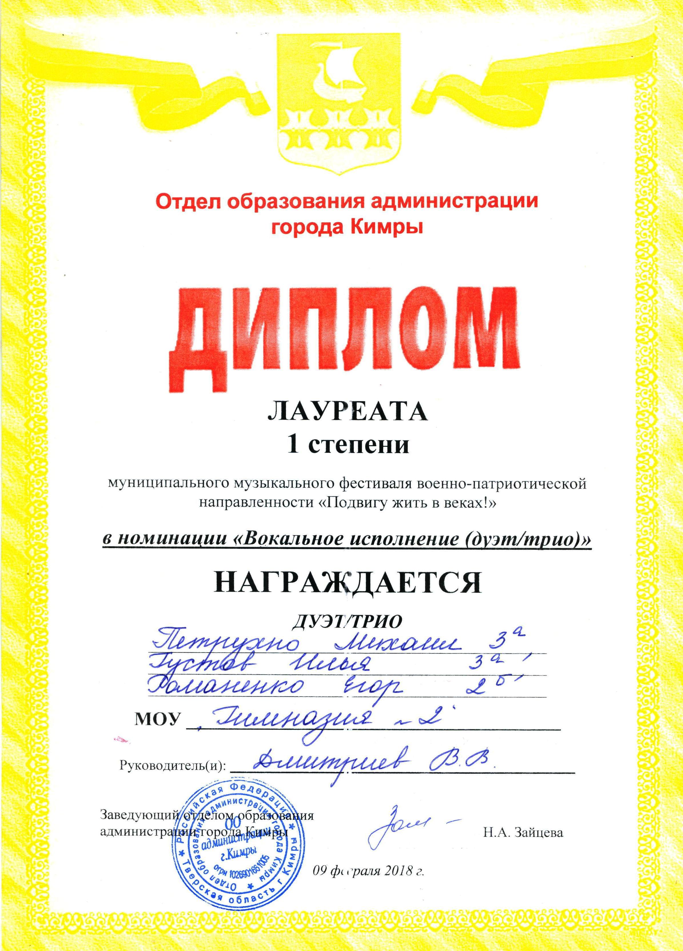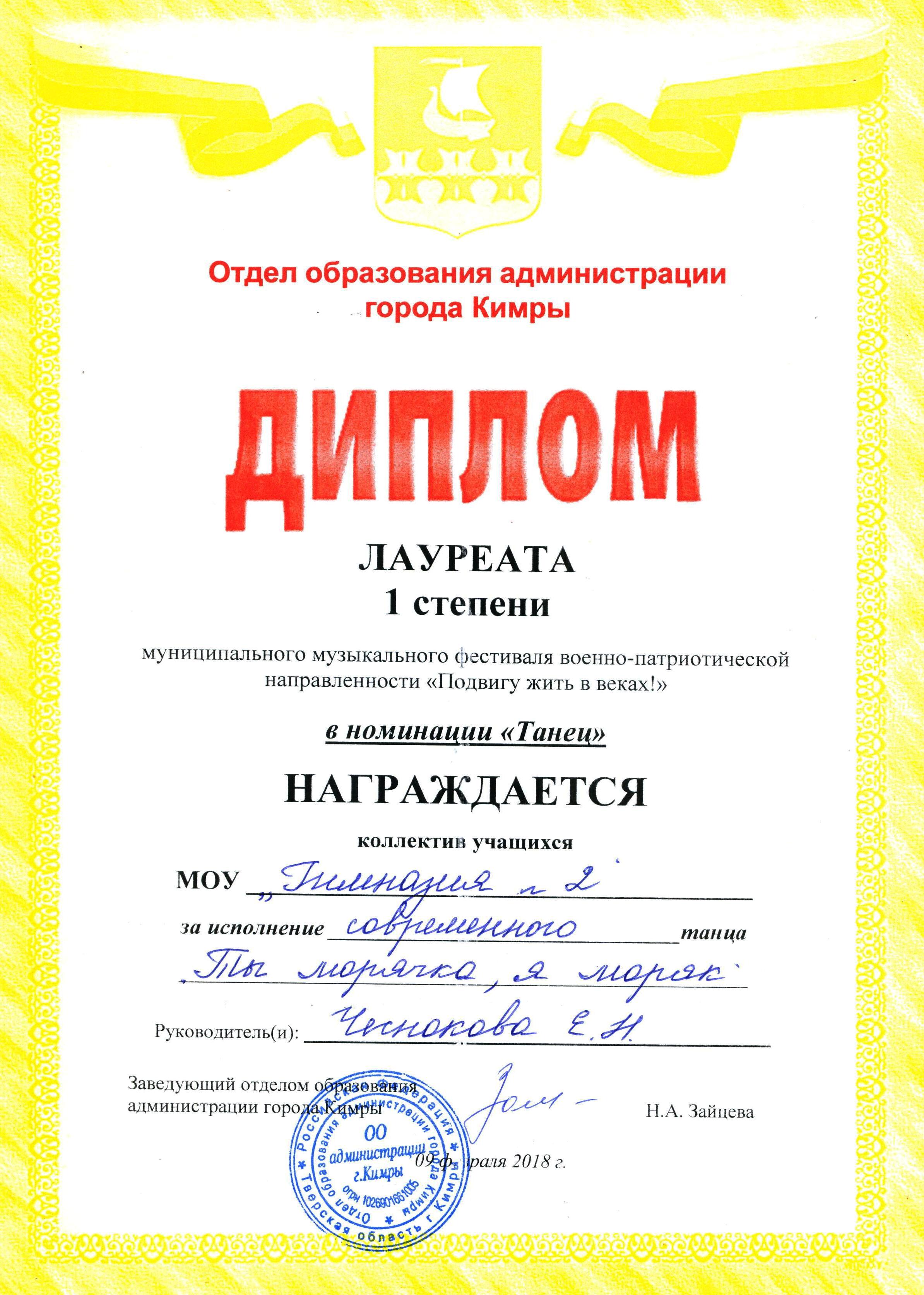 09 февраля 2018 года состоялся муниципальный музыкальный фестиваль военно-патриотической направленности «Подвигу жить в веках!», в котором принимали участие 9 образовательных организаций города. Наши гимназисты приняли активное участие в фестивале и стали победителями в следующих номинациях: номинация «Вокальное исполнение (дуэт/трио)» (руководитель — Дмитриев В.В.); номинация «Танец» (руководитель — Чеснокова Е.Н.). Поздравляем гимназистов и желаем им дальнейших творческих успехов.