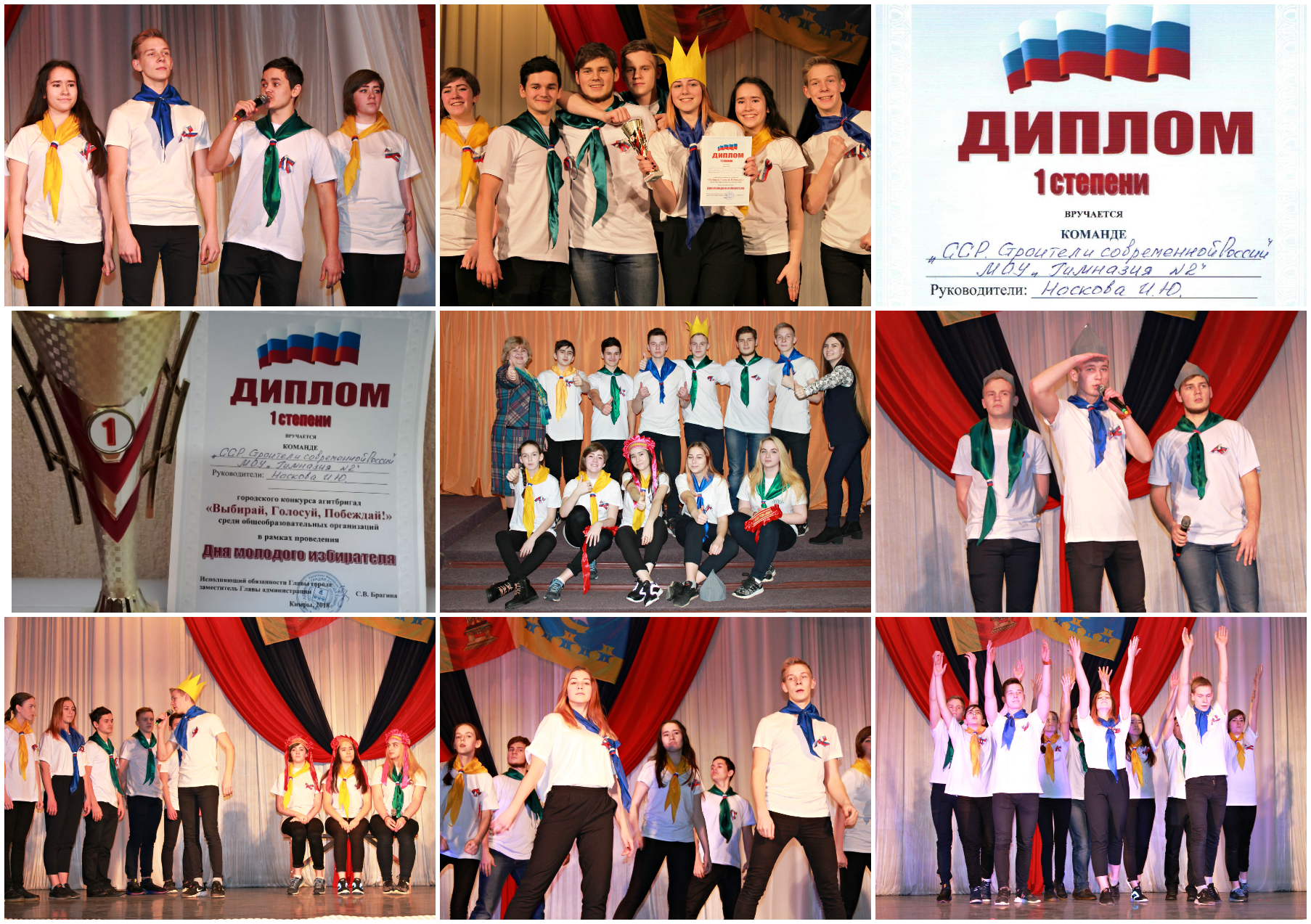 В мероприятии участвовали образовательные учреждения города. Все команды достойно выступили, но самой лучшей агитбригадой была команда «ССР» (Строители Современной России) МОУ «Гимназия №2», которая заняла 1 место!!! Руководитель агитбригады — учитель истории и обществознания Носкова И.Ю.