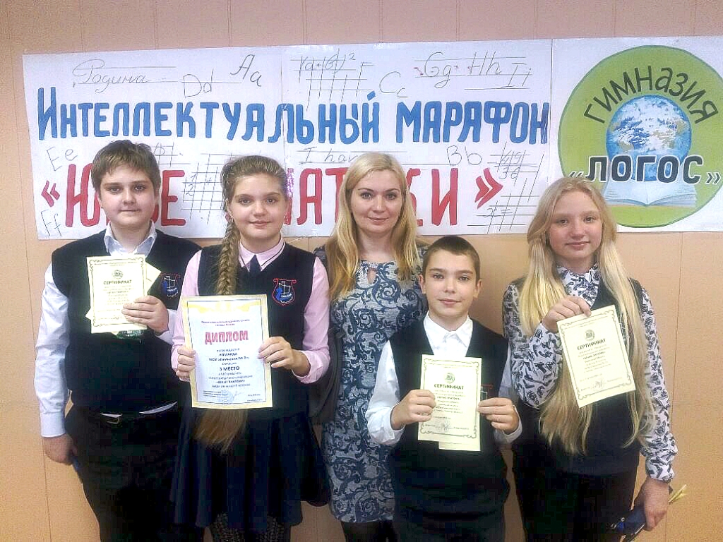 Поздравляем команду гимназистов (Макова В., Балковая М., Кондаков П., Лемешев Е.), занявшую III место в VI городском интеллектуальном марафоне «ЮНЫЕ ЗНАТОКИ» среди 6-х классов!