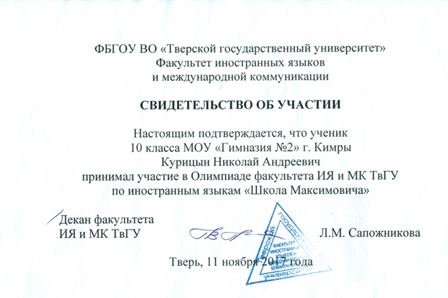 Гимназисты старших классов МОУ «Гимназия №2» уже много лет под руководством учителя английского языка Ступникова Д.Ю. принимают активное участие в Олимпиаде «Школа Максимовича» факультета иностранных языков и международной коммуникации Тверского государственного университета.