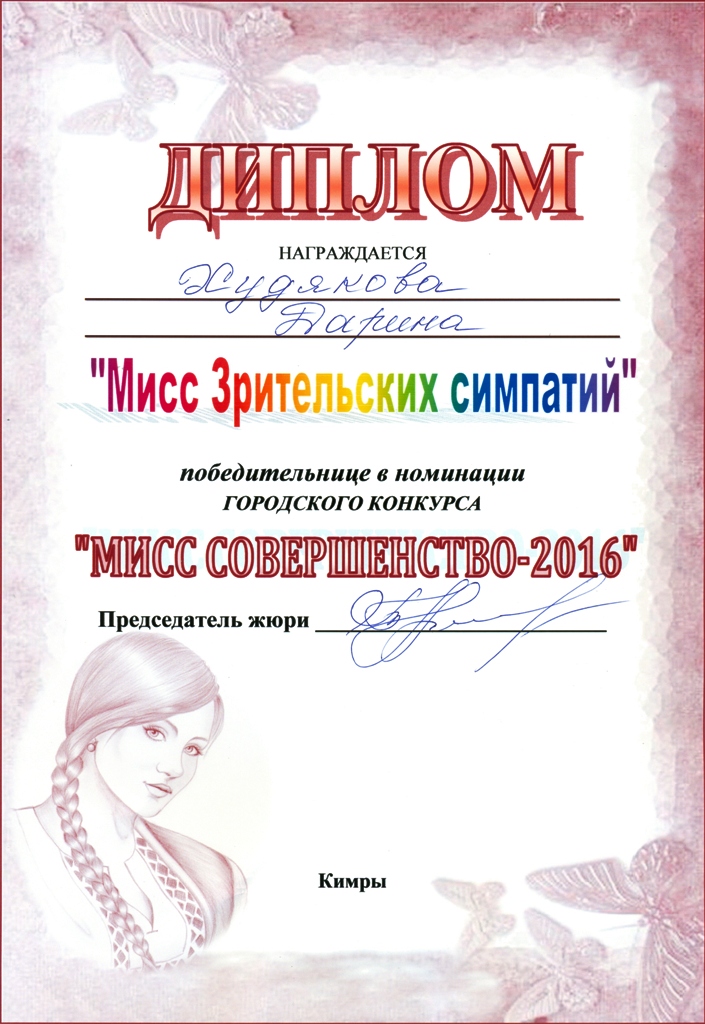Яркое и незабываемое выступление конкурсанта оставило неизгладимое впечатление на всех зрителей конкурса — Худякова Дарина стала победительницей в номинации «Мисс Зрительских симпатий». Поздравляем !!!