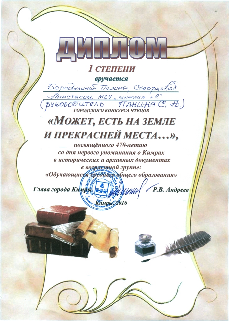 По результатам отборочного этапа, который проводился 15 марта в нашей гимназии, в городском конкурсе приняли участие Дроздова К. (5 «Б»), Повышева Ю. (5 «В»), Петрухно И. (8 «Г»), Бородулина П. (9 «Б»), Худякова Д. (10 «Г») и Скворцова А. (11 «Г»).