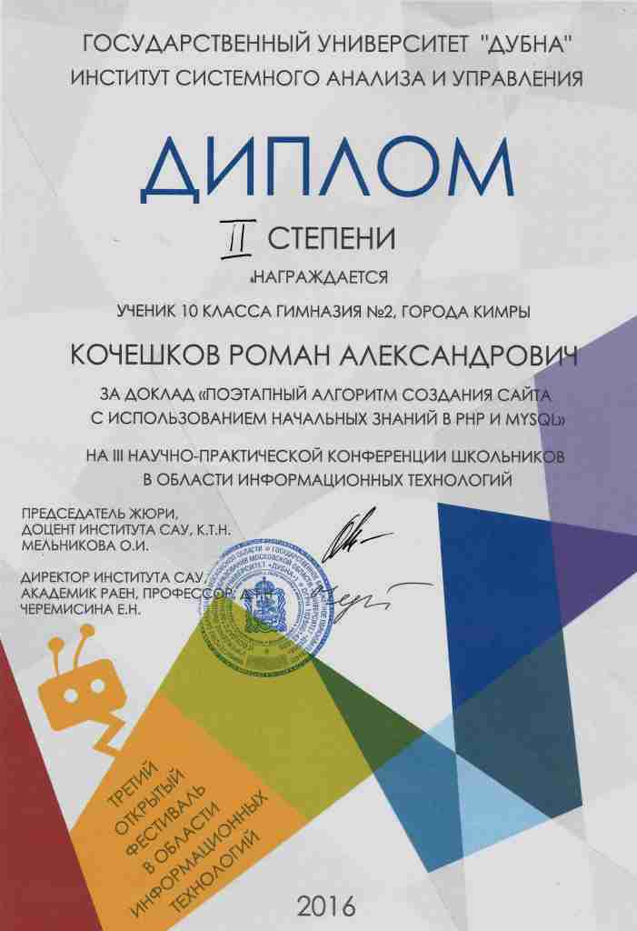 Поздравляем Кочешкова Романа (научный руководитель Нуякшина Д. В.), обучающегося 10 «Г» класса, призёра III научно — практической конференции школьников в области информационных технологий, выступившего с докладом «Поэтапный алгоритм создания сайта с использованием начальных знаний в PHP и MySQL».
