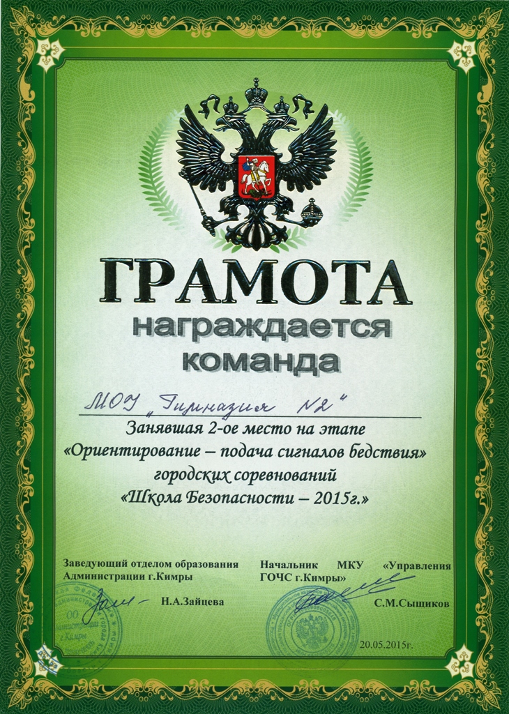 Поздравляем нашу команду гимназистов с награждением Грамотой МКУ «Управление ГОЧС г. Кимры» за хорошее выступление на городских соревнованиях «Школа Безопасности – 2015».
