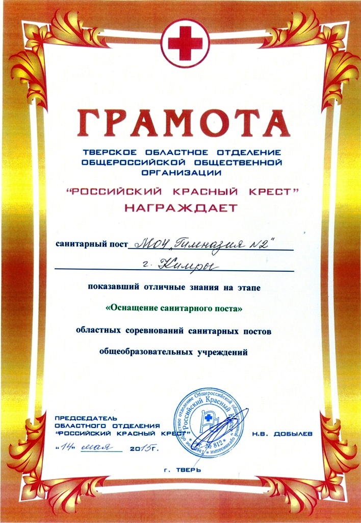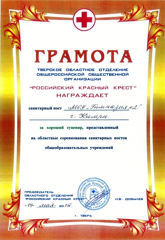 14 мая 2015 года в г. Тверь проходили областные соревнования санитарных постов. Программа соревнований включала следующие этапы: «Гигиена личная и общественная», «Первая помощь при ДТП», «Лекарственные растения», «Оказание первой помощи» (практика), «Оснащение санитарного поста», «История Красного Креста», «Уход за больными на дому». Кроме того, представлялись на конкурс санитарные бюллетени на темы «Гигиена школьника» и «Профилактика вредных привычек», сувениры по тематике Красного Креста и художественные номера, посвященные 70-летию Победы.